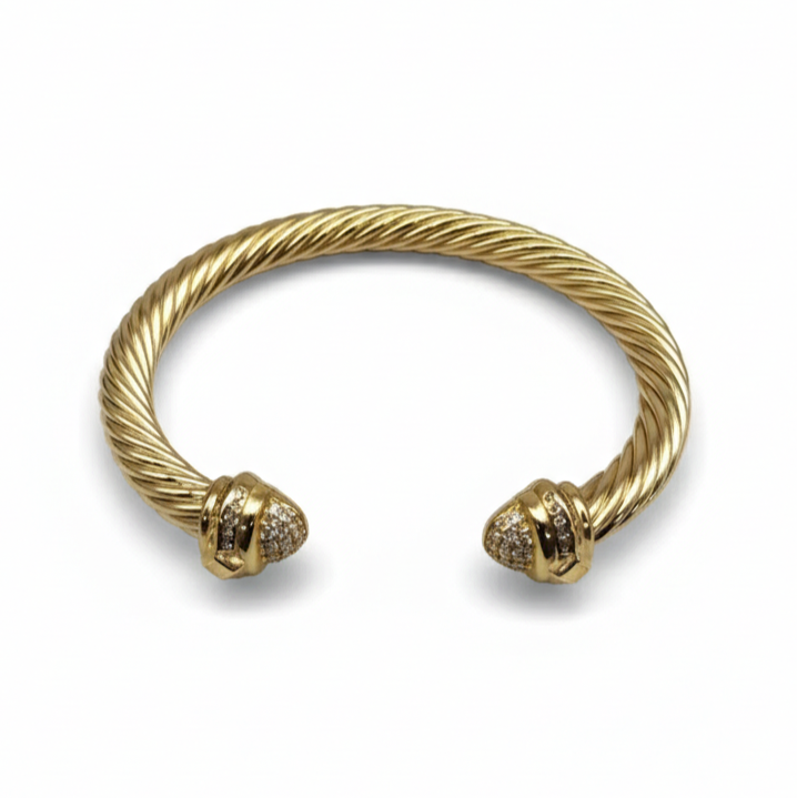 Crafted in S925 sterling silver, and finished with 14k gold vermeil accents, the Esther™ 7mm Pavé Cable Bangle features a sculpted twisted cable silhouette anchored by rounded pavé-set end caps. At 7mm in width, it offers the perfect balance of presence and polish.